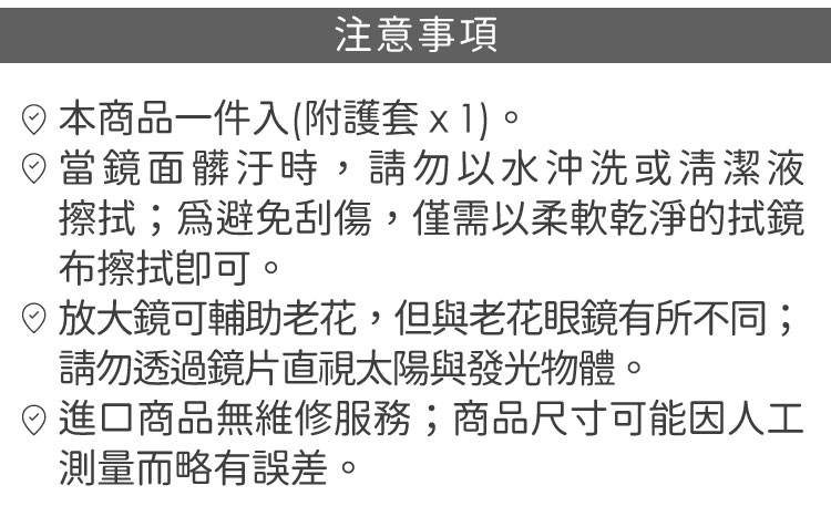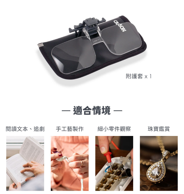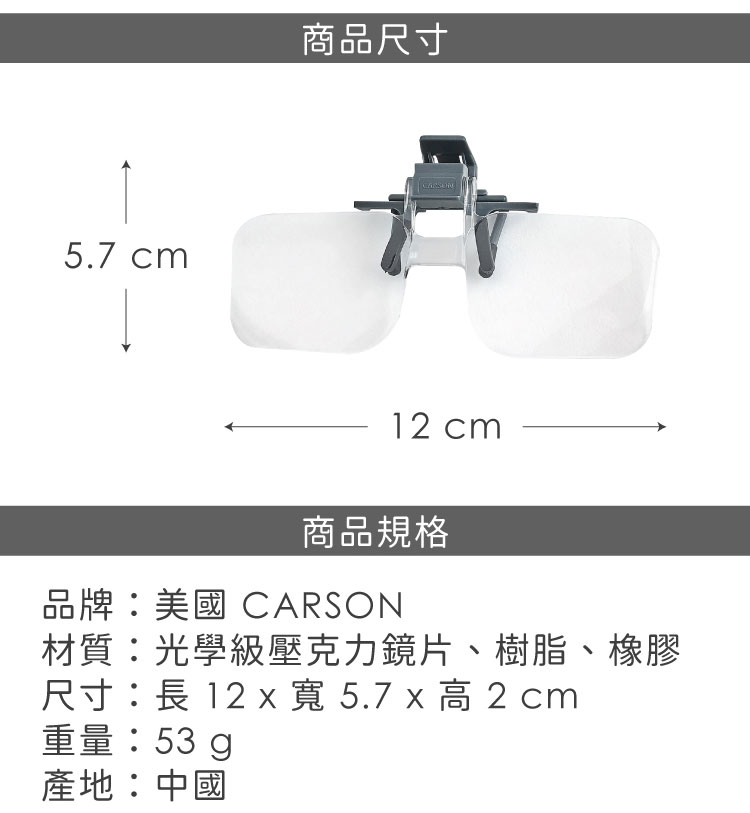 品牌:美國 CARSON材質:光學級壓克力鏡片、樹脂、橡膠尺寸:長 12 x 寬 5.7 x 高 2 cm重量:46 g產地:中國備註:進口商品無維修服務;商品尺寸可能因人工測量而略有誤差