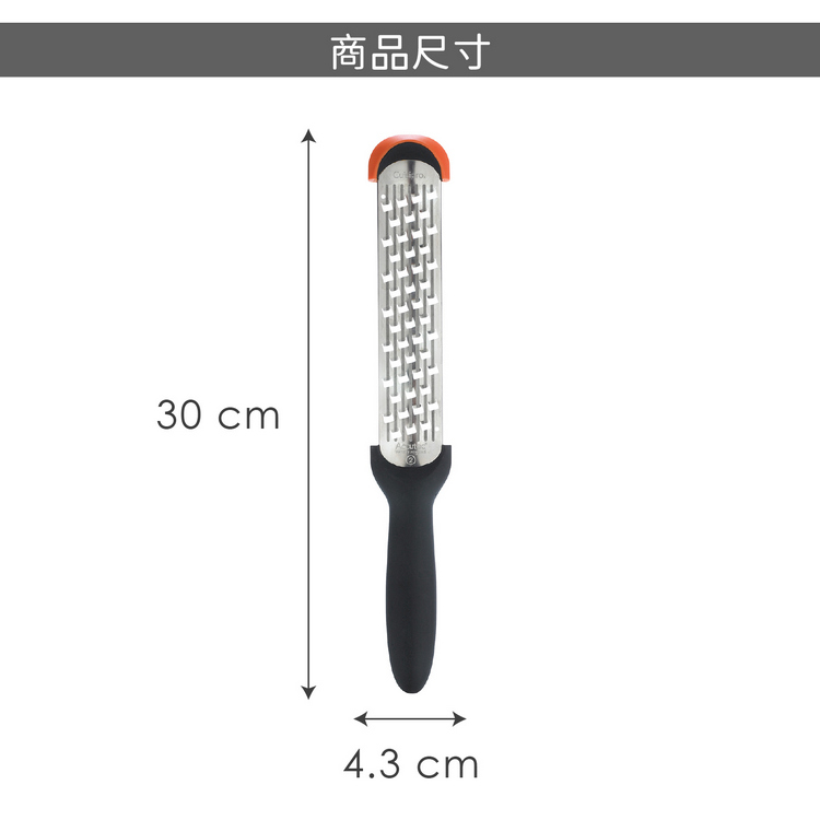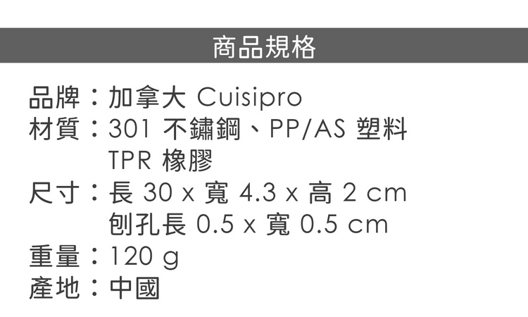 品牌:加拿大 Cuisipro材質:301 不鏽鋼、PP/AS 塑料、TPR 橡膠尺寸:長 30 x 寬 4.3 x 高 2 cm;刨孔長 0.5 x 寬 0.5 cm重量:120 g產地:中國