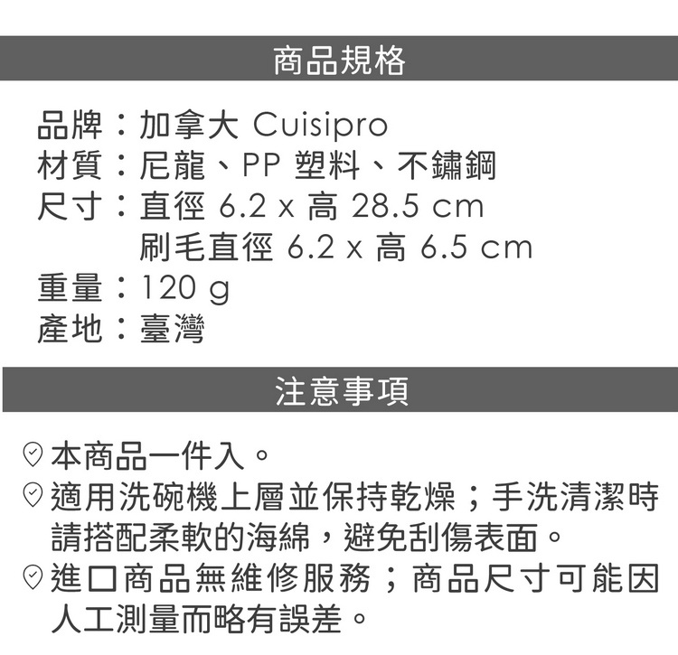 品牌:加拿大 Cuisipro材質:尼龍、PP 塑料、不鏽鋼尺寸:直徑 6.2 x 高 28.5 cm;刷毛直徑 6.2 x 高 6.5 cm重量:120 g產地:臺灣