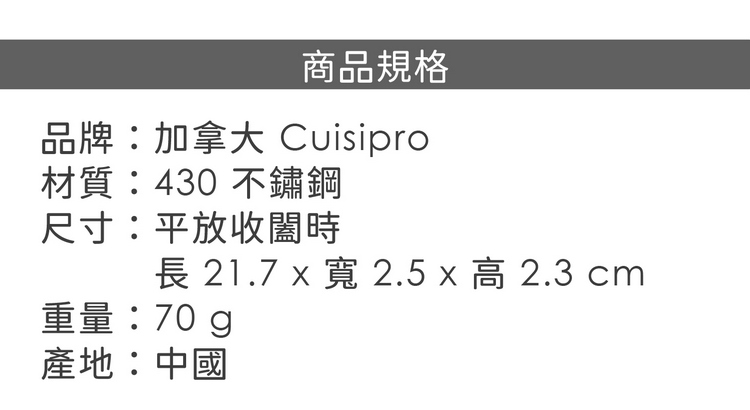品牌:加拿大 Cuisipro材質:430 不鏽鋼尺寸:平放收闔時長 21.7 x 寬 2.5 x 高 2.3 cm重量:70 g產地:中國
