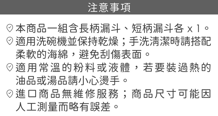 品牌:美國 FOX RUN BRANDS材質:201 不鏽鋼尺寸:長柄漏斗含柄長 10 x 寬 5.5 x 高 5 cm、開口內徑 5 cm、底部漏口直徑 0.7 cm;短柄漏斗含柄長 6.5 x 寬 5.5 x 高 5.5 cm、開口內徑 5 cm、底部漏口直徑 0.7 cm重量:30 g產地:中國