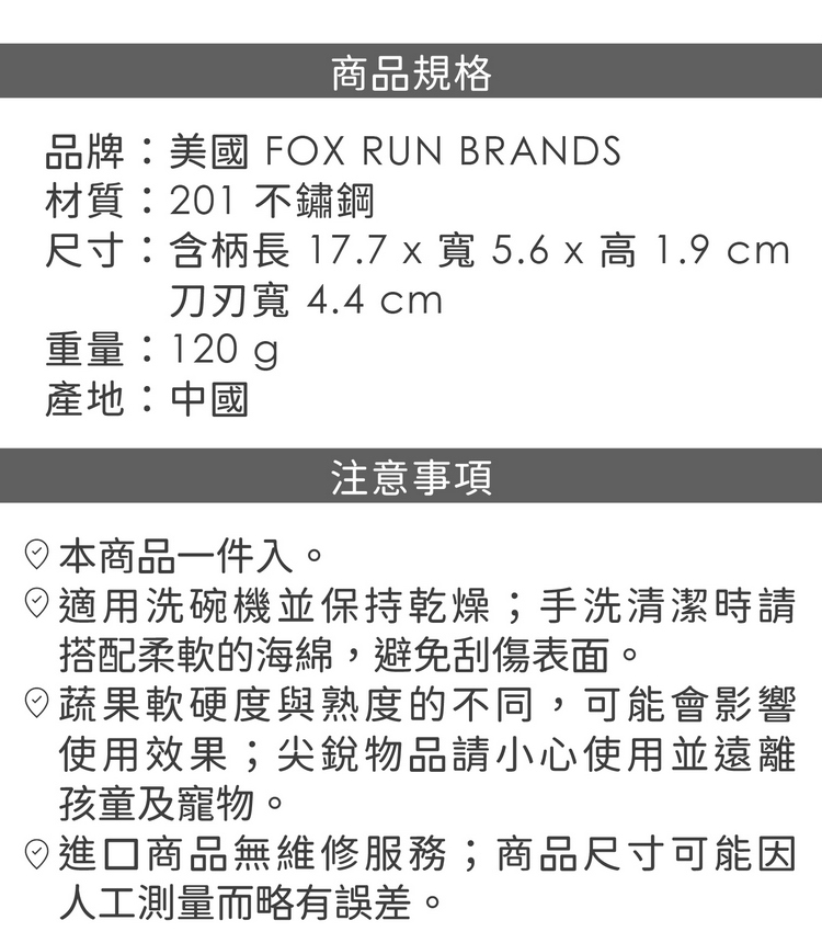品牌:美國 FOX RUN BRANDS材質:201 不鏽鋼尺寸:含柄長 17.7 x 寬 5.6 x 高 1.9 cm;刀刃寬 4.4 cm重量:120 g產地:中國