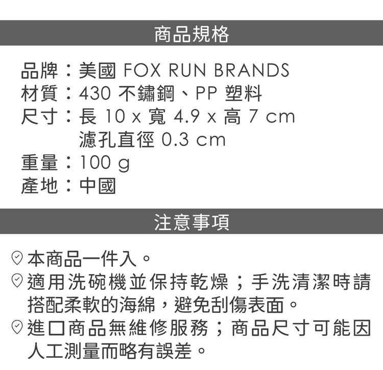 品牌:美國 FOX RUN BRANDS材質:430 不鏽鋼、PP 塑料尺寸:長 10 x 寬 4.9 x 高 7 cm;濾孔直徑 0.3 cm重量:100 g產地:中國
