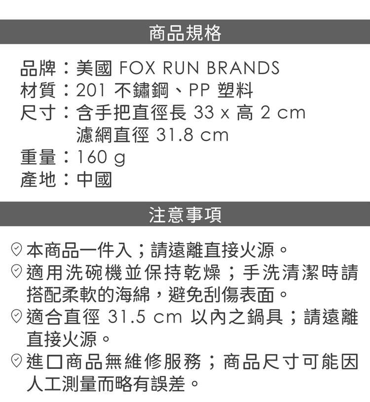 品牌:美國 FOX RUN BRANDS材質:201 不鏽鋼、PP 塑料尺寸:含手把直徑長 33 x 高 2 cm;濾網直徑 31.8 cm重量:160 g產地:中國