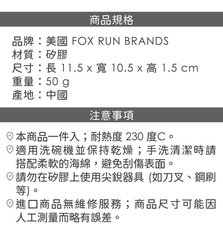 品牌:美國 FOX RUN BRANDS材質:矽膠尺寸:長 11.5 x 寬 10.5 x 高 1.5 cm重量:50 g產地:中國
