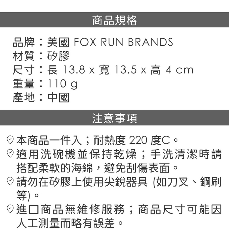 品牌:美國 FOX RUN BRANDS材質:矽膠尺寸:長 13.8 x 寬 13.5 x 高 4 cm重量:110 g產地:中國