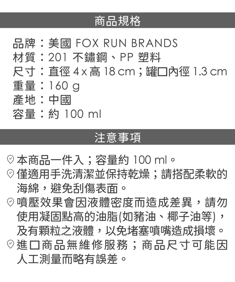 品牌:美國 FOX RUN BRANDS材質:201 不鏽鋼、PP 塑料尺寸:直徑 4 x 高 18 cm;罐口內徑 1.3 cm重量:160 g產地:中國容量:約 100 ml