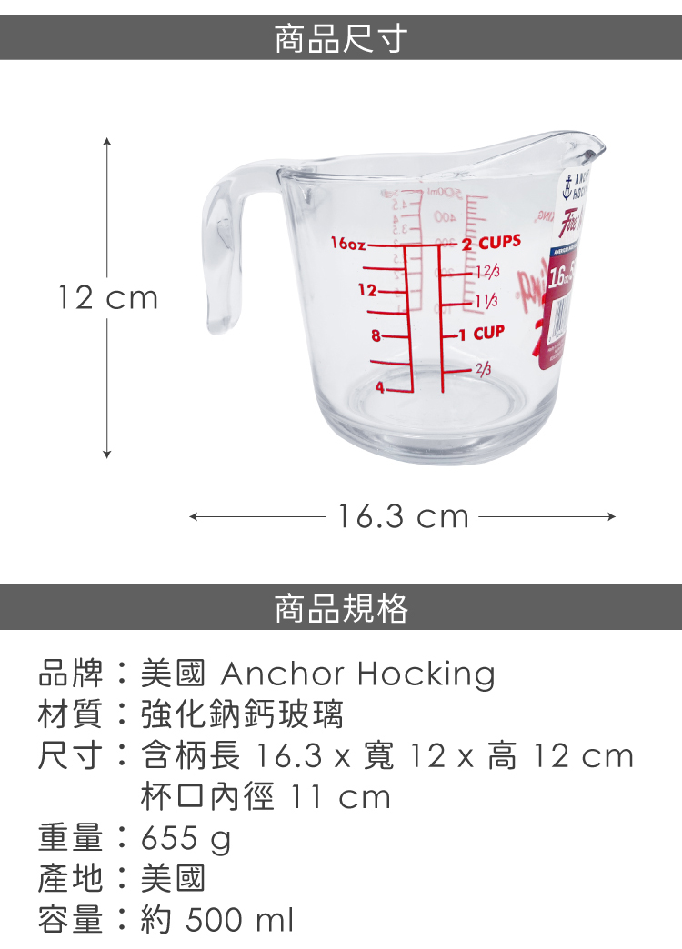 品牌:美國 FOX RUN BRANDS材質:強化鈉鈣玻璃尺寸:含柄長 16.3 x 寬 12 x 高 12 cm、杯口內徑 11 cm容量:約 500 ml重量:655 g產地:美國備註:進口商品無維修服務;商品尺寸可能因人工測量而略有誤差