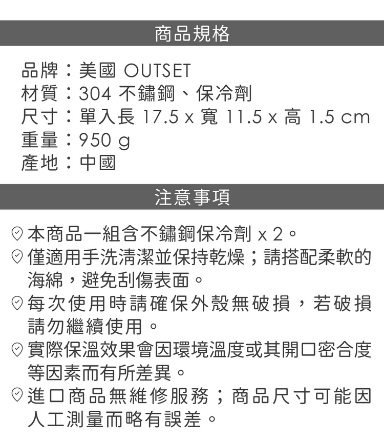品牌:美國 OUTSET材質:304 不鏽鋼、保冷劑尺寸:單入長 17.5 x 寬 11.5 x 高 1.5 cm重量:950 g產地:中國