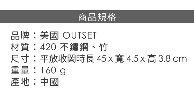 品牌:美國 OUTSET材質:420 不鏽鋼、竹尺寸:平放收闔時長 45 x 寬 4.5 x 高 3.8 cm重量:160 g產地:中國