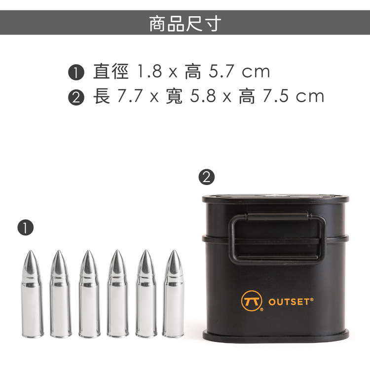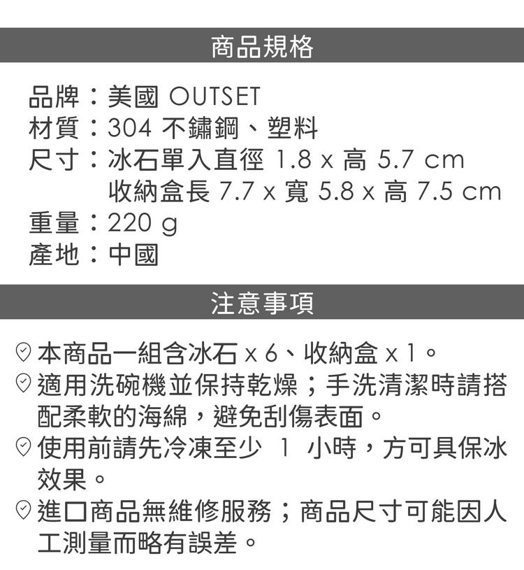 品牌:美國 OUTSET材質:304 不鏽鋼、塑料尺寸:冰石單入直徑 1.8 x 高 5.7 cm;收納盒長 7.7 x 寬 5.8 x 高 7.5 cm重量:220 g產地:中國