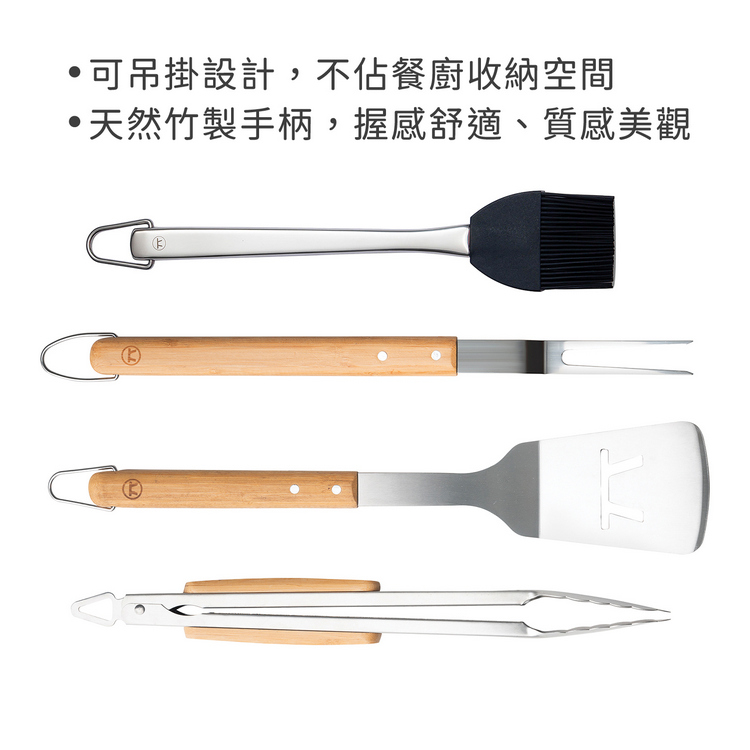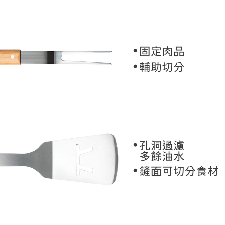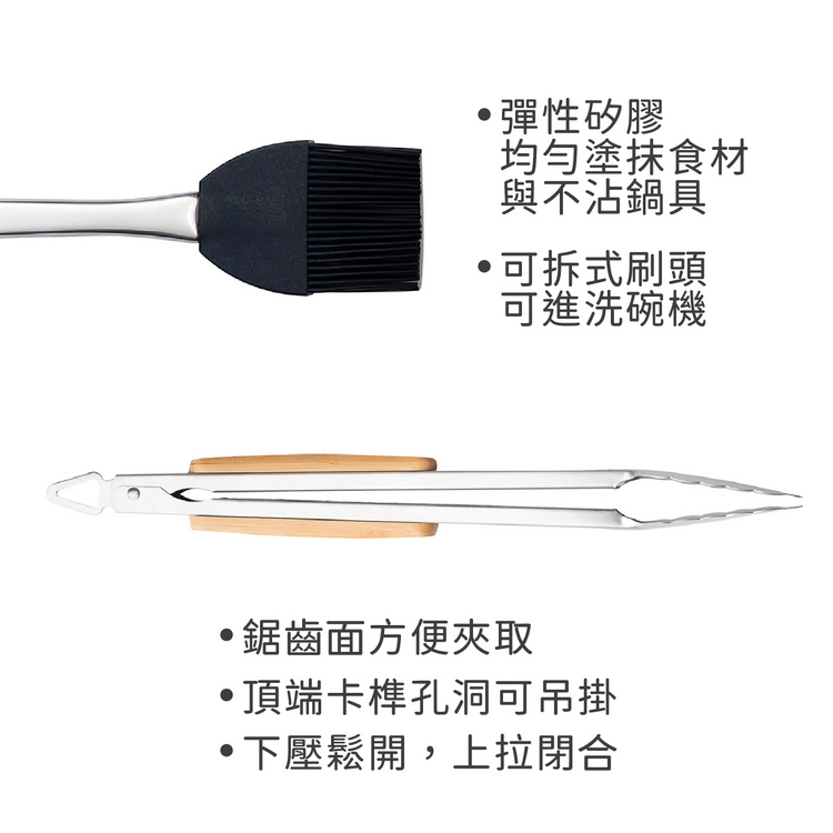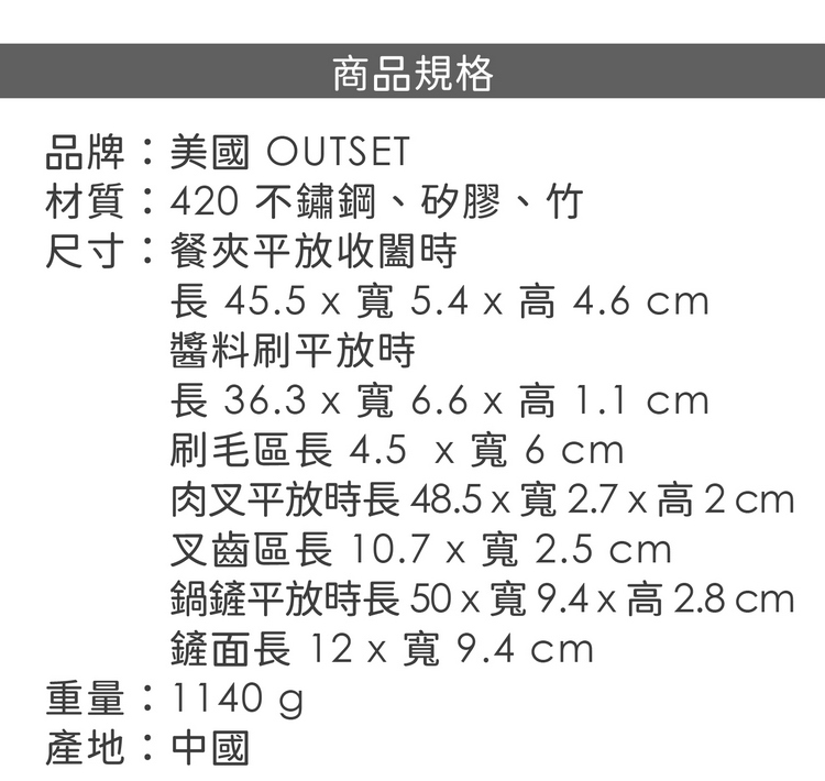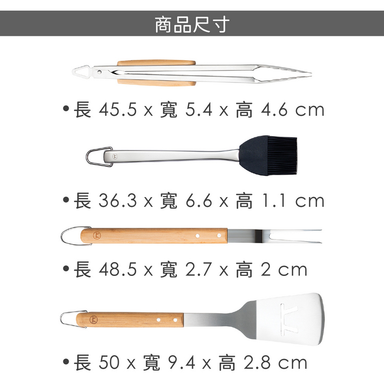 尺寸:餐夾平放收闔時長 45.5 x 寬 5.4 x 高 4.6 cm;醬料刷平放時長 36.3 x 寬 6.6 x 高 1.1 cm、刷毛區長 4.5 x 寬 6 cm;肉叉平放時長 48.5 x 寬 2.7 x 高 2 cm、叉齒區長 10.7 x 寬 2.5 cm;鍋鏟平放時長 50 x 寬 9.4 x 高 2.8 cm、鏟面長 12 x 寬 9.4 cm