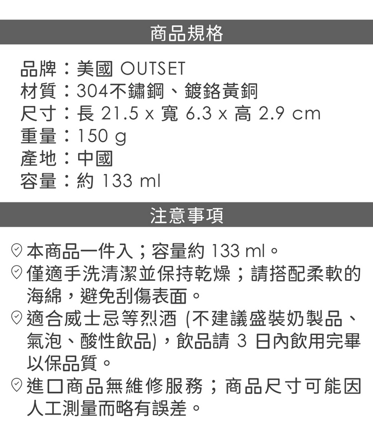 品牌:美國 OUTSET材質:304不鏽鋼、鍍鉻黃銅尺寸:長 21.5 x 寬 6.3 x 高 2.9 cm重量:150 g產地:中國容量:約 133 ml