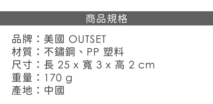 品牌:美國 OUTSET材質:不鏽鋼、PP 塑料尺寸:長 25 x 寬 3 x 高 2 cm重量:170 g產地:中國