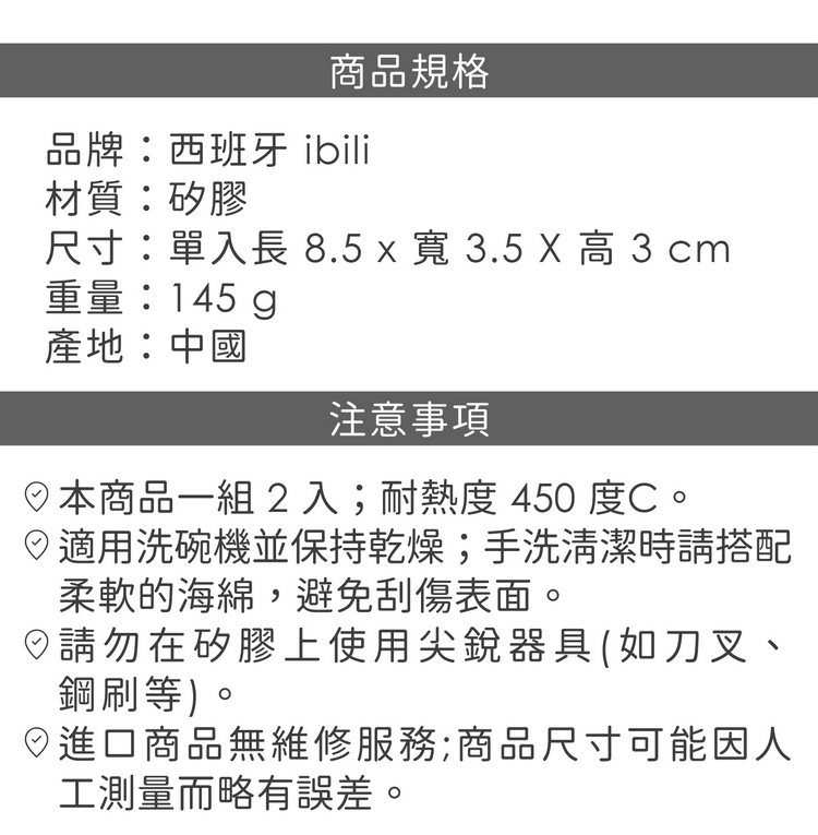 品牌:西班牙 ibili材質:矽膠尺寸:單入長 8.5 x 寬 3.5 X 高 3 cm重量:145 g產地:中國