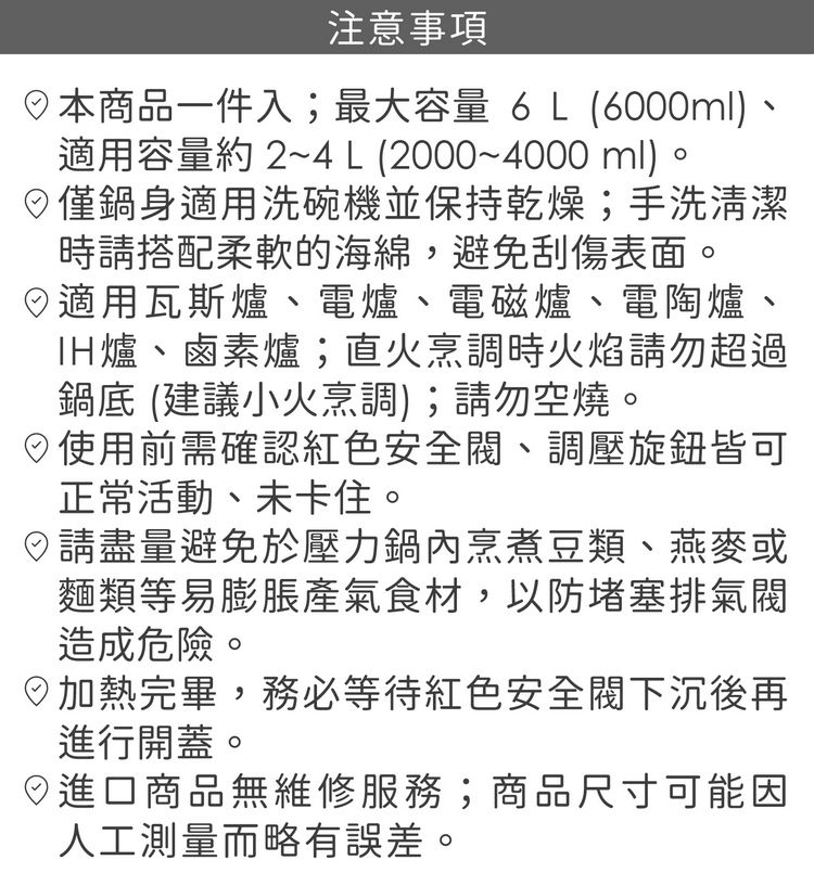 品牌:西班牙 ibili材質:316 不鏽鋼、電木樹脂尺寸:鍋身含柄長 45.5 x 寬 24.5 x 高 16.3 cm;內徑 22 x 高 16 cm;鍋蓋長 41.3 x 寬 24.7 x 高 7 cm重量:3610 g產地:中國容量:最大容量 6 L (6000 ml);適用容量約 2~4 L (2000~4000 ml)