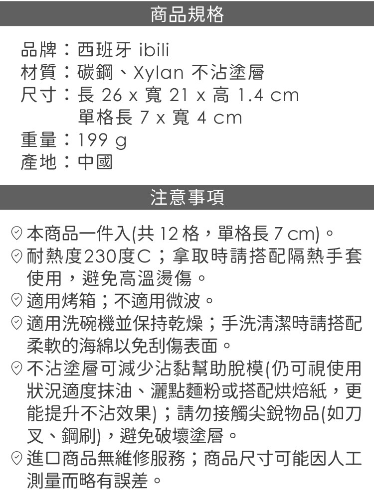品牌:西班牙 ibili材質:碳鋼、Xylan 不沾塗層尺寸:長 26 x 寬 21 x 高 1.4 cm、單格長 7 x 寬 4 cm重量:199 g產地:中國備註:進口商品無維修服務;商品尺寸可能因人工測量而略有誤差