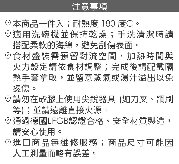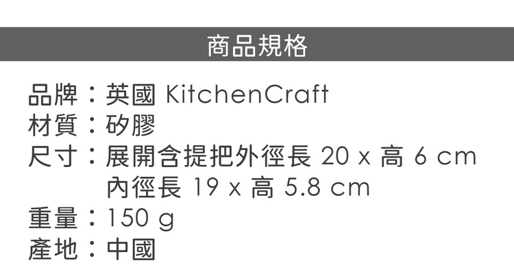 品牌:英國 KitchenCraft材質:矽膠尺寸:展開含提把外徑長 20 x 高 6 cm;內徑長 19 x 高 5.8 cm重量:150 g產地:中國