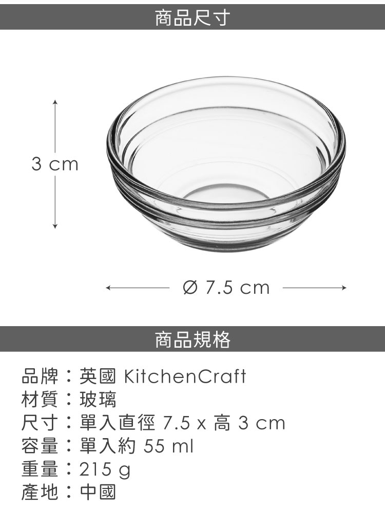 品牌:英國 KitchenCraft材質:玻璃尺寸:單入直徑 7.5 x 高 3 cm容量:約 55 ml重量:215 g產地:中國備註:進口商品無維修服務;商品尺寸可能因人工測量而略有誤差