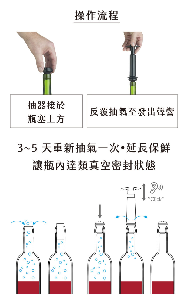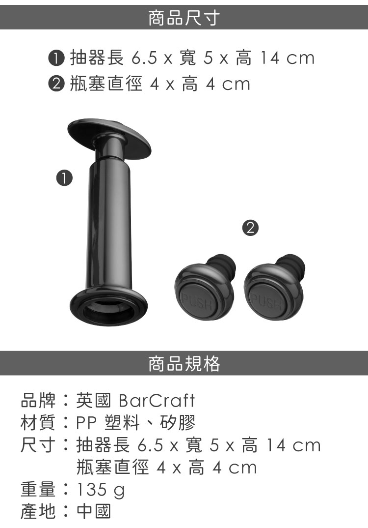 品牌:英國 BarCraft材質:PP 塑料、矽膠尺寸:抽真空器直徑 4.7 x 長 14 cm;瓶塞直徑 4 x 高 4 cm重量:135 g產地:中國備註:進口商品無維修服務;商品尺寸可能因人工測量而略有誤差