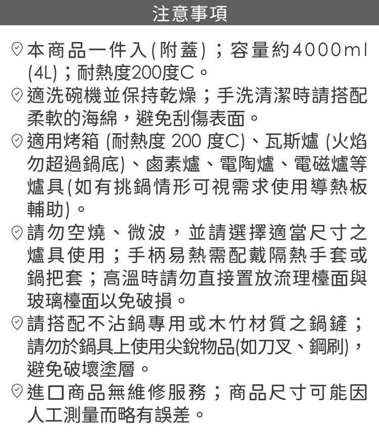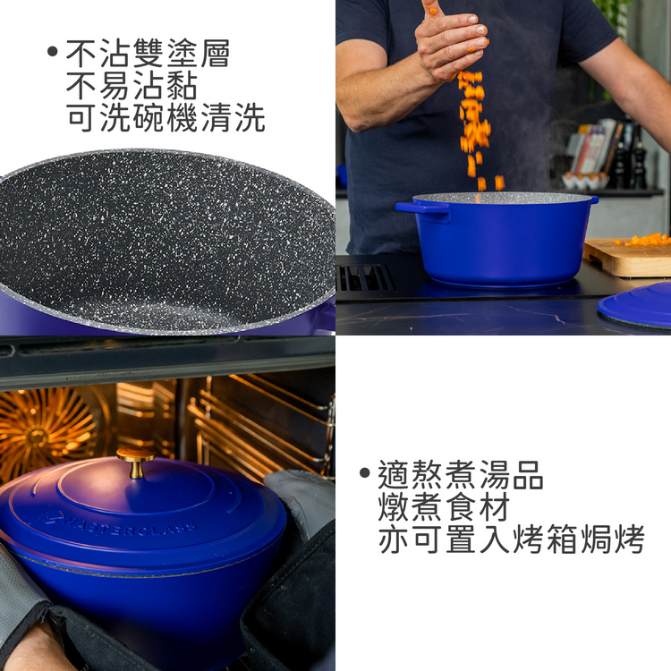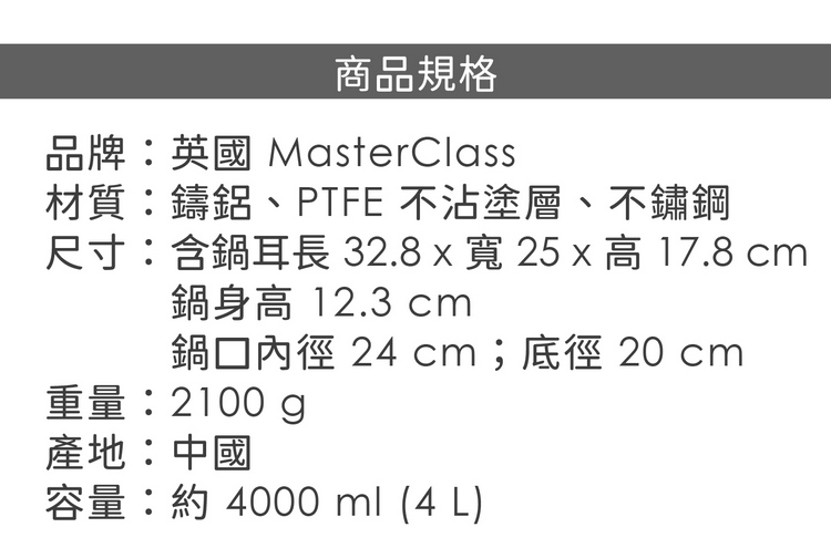品牌:英國 MasterClass材質:鑄鋁、PTFE 不沾塗層、不鏽鋼尺寸:含鍋耳長 32.8 x 寬 25 x 高 17.8 cm;鍋身高 12.3 cm;鍋口內徑 24 cm;底徑 20 cm重量:2100 g產地:中國容量:約 4000 ml (4 L)