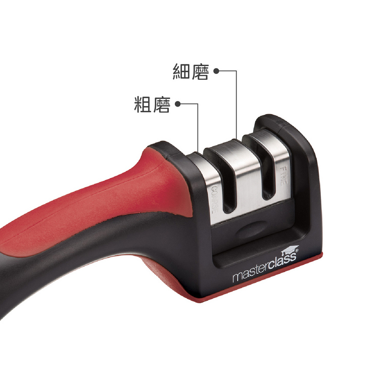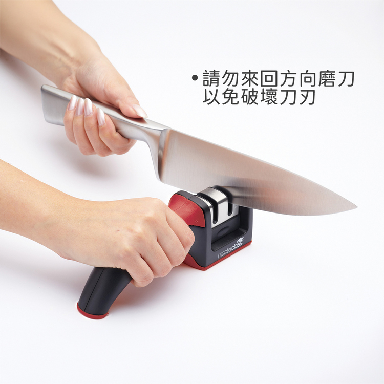 本商品一件入、僅適擦拭清潔;操作時週邊請保持淨空以防割傷意外發生。刀子用久變鈍,處理食材不僅不方便,也少了烹煮時的俐落感。此時您可試試此款磨刀器,一手握住符合人體工學且止滑的握把,另一手將刀刃以 90 度交接磨刀器的方式插入 Coarse 粗磨式的不鏽鋼磨刀,往後拉動磨至刀尖處即可,依照相同方式約磨 5 次,刀刃即恢復銳利 (請勿來回方向磨刀以免破壞刀刃);接著使用第二段的 Fine 細磨方式的陶瓷磨刀,讓刀刃更細緻尖銳。簡單又安全幾步驟,讓家中鈍刀煥然一新。