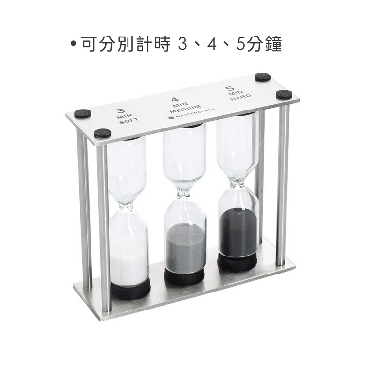 1850 年創立的英國家族企業 Kitchen Craft,在創始人努力下,成功拓展旗下的系列品牌。專為料理高手與烘焙行家打造的品牌 Master Class,推出多元進階版餐廚用品,讓使用率高的消費者也能得心應手,為家居與餐廚提供更多美好的選擇。 本商品一件入(共有三種顏色的細沙,可分別計時 3、4、5分鐘,將影響煮蛋時的熟度);僅適擦拭清潔。精確拿捏食物烹煮時間是料理美味的秘訣;專為水煮蛋設計的計時沙漏,可測 3 分鐘軟嫩蛋、4 分鐘半熟蛋、5 分鐘熟蛋,不是大廚也能輕鬆端出軟嫩彈牙的水煮蛋。沙漏不鏽鋼框架顯示出質感與細緻,擺飾上更增添廚房的視覺美感。