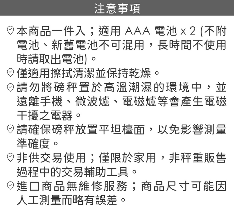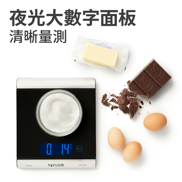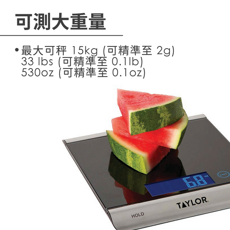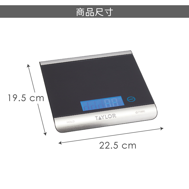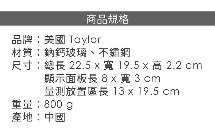 品牌:美國 Taylor材質:鈉鈣玻璃、不鏽鋼尺寸:總長 22.5 x 寬 19.5 x 高 2.2 cm;顯示面板長 8 x 寬 3 cm;量測放置區長 13 x 19.5 cm重量:800 g產地:中國