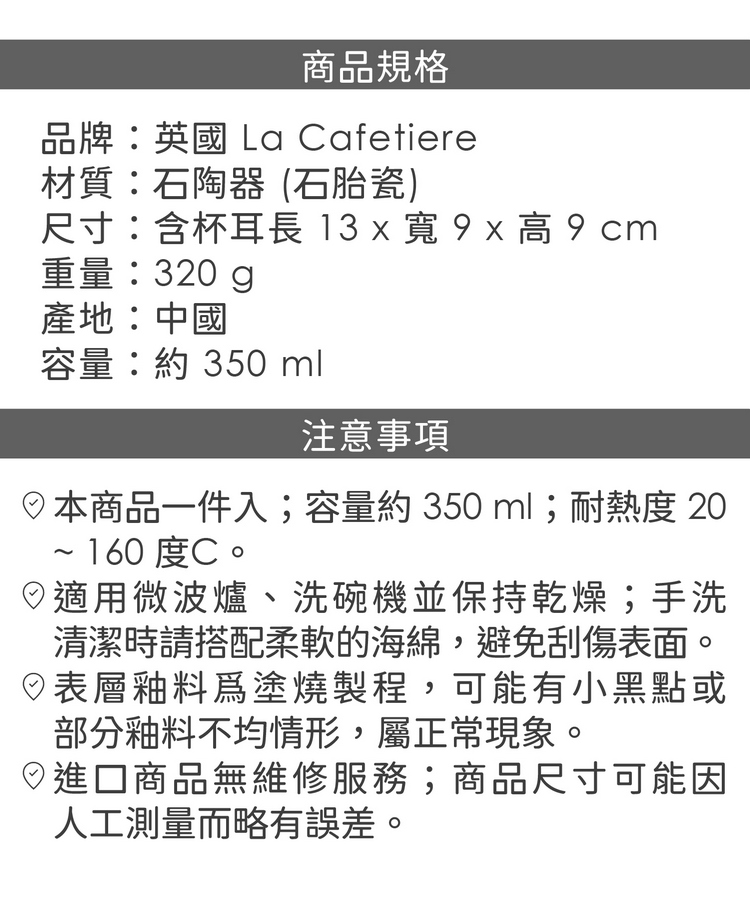 品牌:英國 La Cafetiere材質:石陶器 (石胎瓷)尺寸:含杯耳長 13 x 寬 9 x 高 9 cm重量:320 g產地:中國容量:約 350 ml