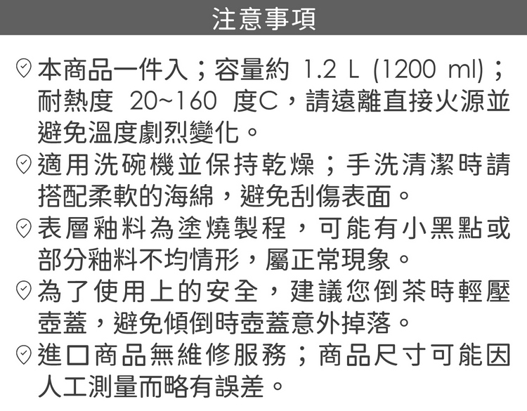 品牌:英國 La Cafetiere材質:石陶器 (石胎瓷)尺寸:含提把長 25 x 寬 16.5 x 高 13.5 cm重量:1430 g產地:中國容量:約 1.2 L (1200 ml)
