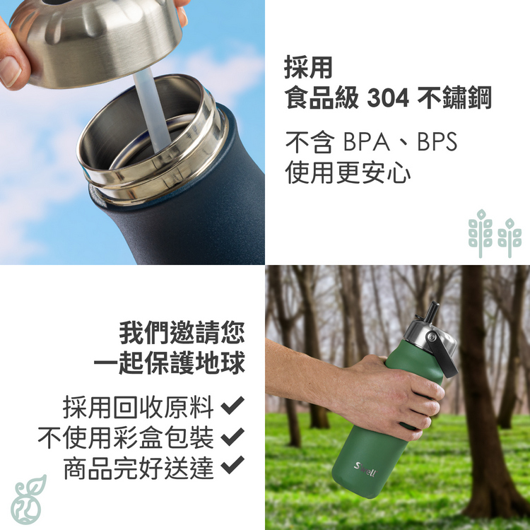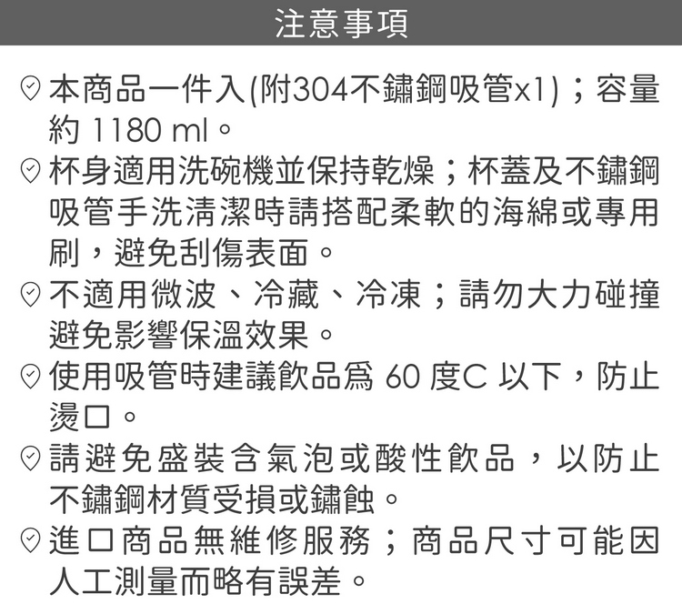品牌: 美國 S'well材質:304 不鏽鋼、銅、矽膠、塑料尺寸:含杯耳、吸管長 13 x 寬 9 x 高 31 cm;瓶口內徑 8.5 cm、底徑 7.7 cm;吸管直徑 0.6 x 高 30 cm、內徑 0.5 cm重量:560 g產地:中國容量:約 1180 ml