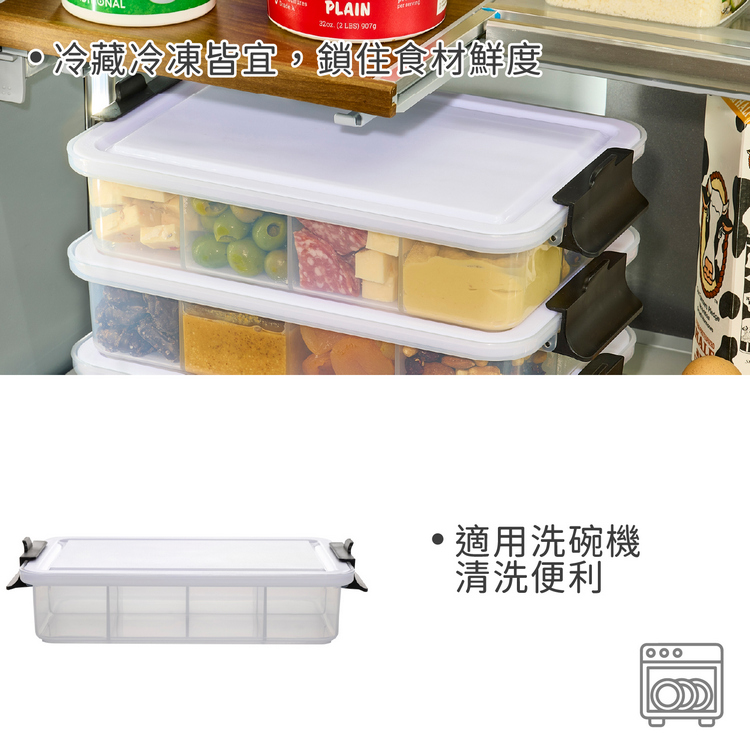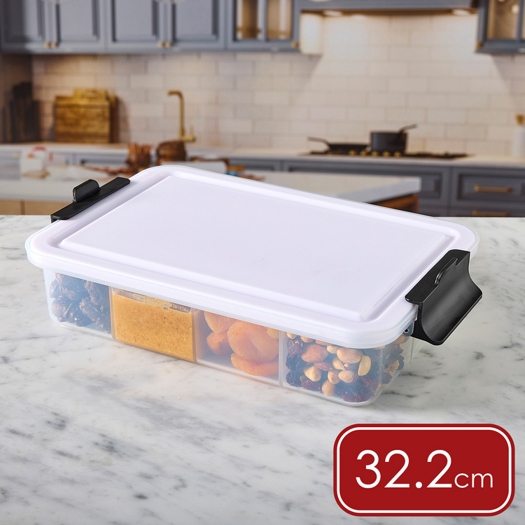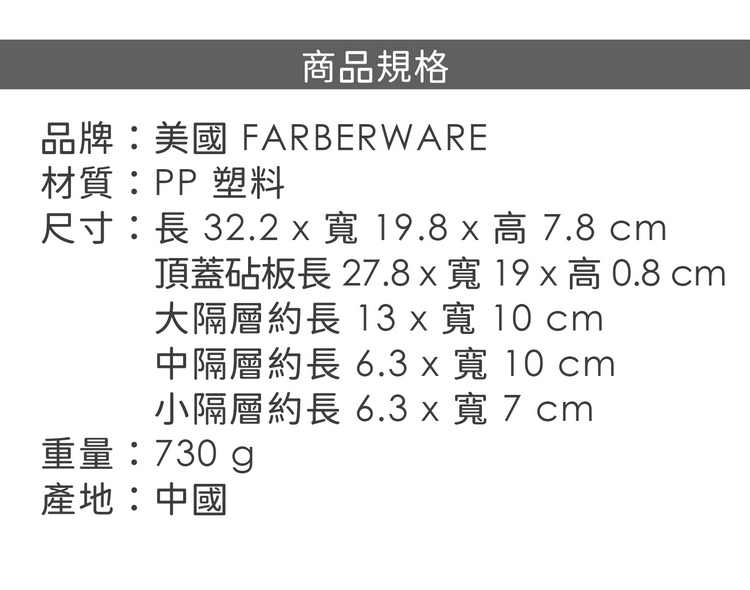 品牌: 美國 FARBERWARE材質:PP 塑料尺寸:長 32.2 x 寬 19.8 x 高 7.8 cm;頂蓋砧板長 27.8 x 寬 19 x 高 0.8 cm;大隔層約長 13 x 寬 10 cm、中隔層約長 6.3 x 寬 10 cm、小隔層約長 6.3 x 寬 7 cm重量:730 g產地:中國