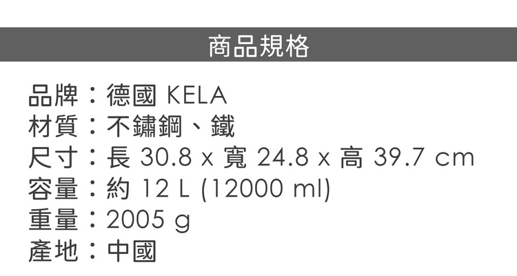 品牌:德國 KELA材質:不鏽鋼、鐵尺寸:長 30.8 x 寬 24.8 x 高 39.7 cm容量:約 12 L (12000 ml)重量:2005 g產地:中國備註:進口商品無維修服務;商品尺寸可能因人工測量而略有誤差