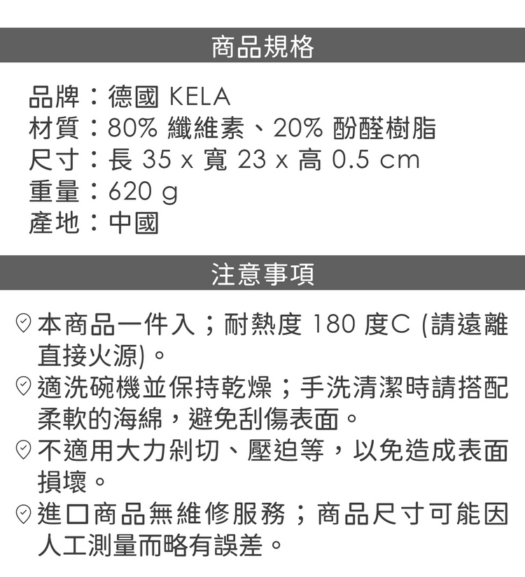 品牌:德國 KELA材質:80% 纖維素、20% 酚醛樹脂尺寸:長 35 x 寬 23 x 高 0.5 cm重量:620 g產地:中國