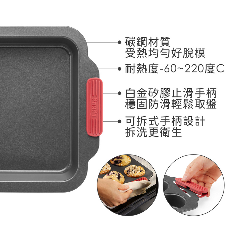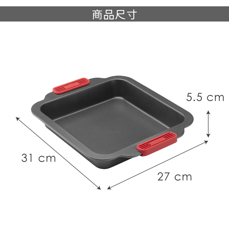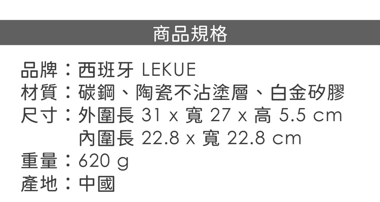 品牌:西班牙 LEKUE材質:碳鋼、陶瓷不沾塗層、白金矽膠尺寸:外圍長 31 x 寬 27 x 高 5.5 cm;內圍長 22.8 x 寬 22.8 cm重量:620 g產地:中國