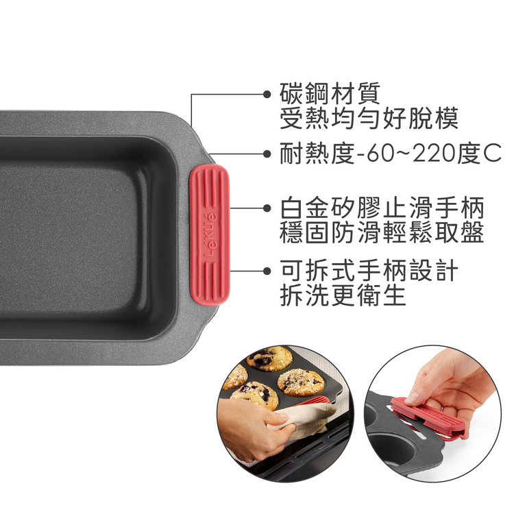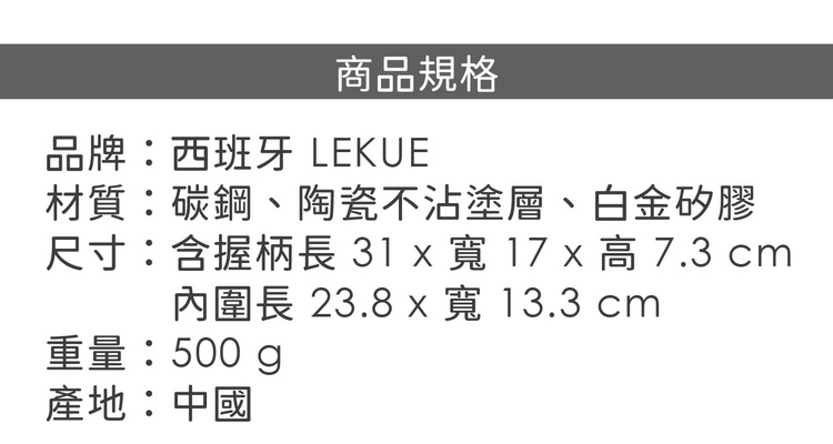 品牌:西班牙 LEKUE材質:碳鋼、陶瓷不沾塗層、白金矽膠尺寸:含握柄長 31 x 寬 17 x 高 7.3 cm;內圍長 23.8 x 寬 13.3 cm重量:500 g產地:中國