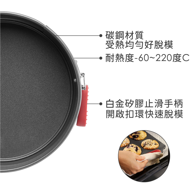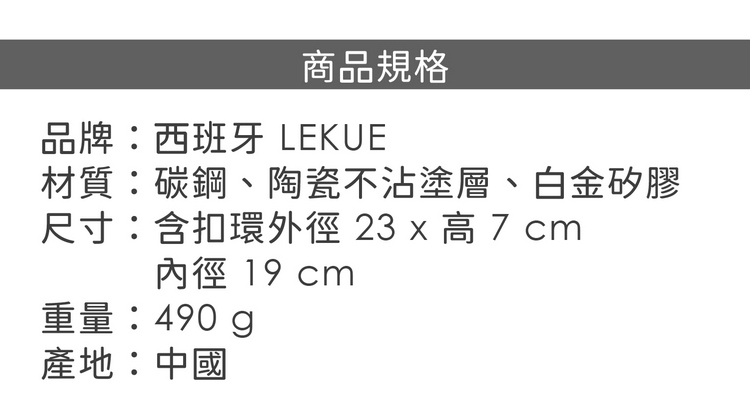 品牌:西班牙 LEKUE材質:碳鋼、陶瓷不沾塗層、白金矽膠尺寸:含扣環外徑 23 x 高 7 cm、內徑 19 cm重量:490 g產地:中國