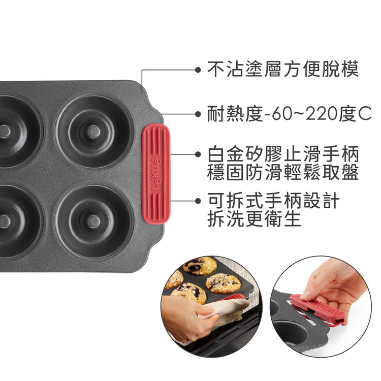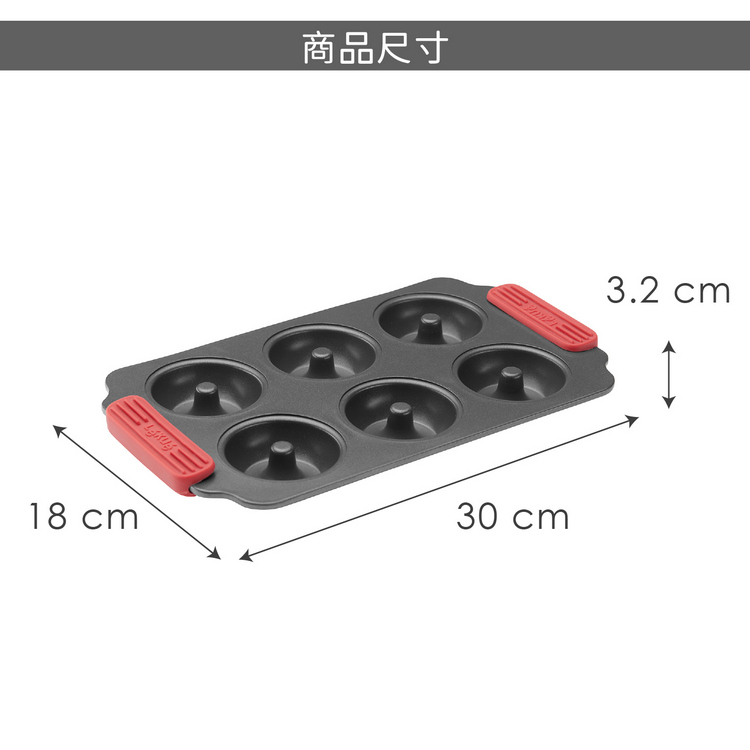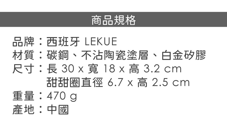 品牌:西班牙 LEKUE材質:碳鋼、不沾陶瓷塗層、白金矽膠尺寸:長 30 x 寬 18 x 高 3.2 cm;甜甜圈直徑 6.7 x 高 2.5 cm重量:470 g產地:中國