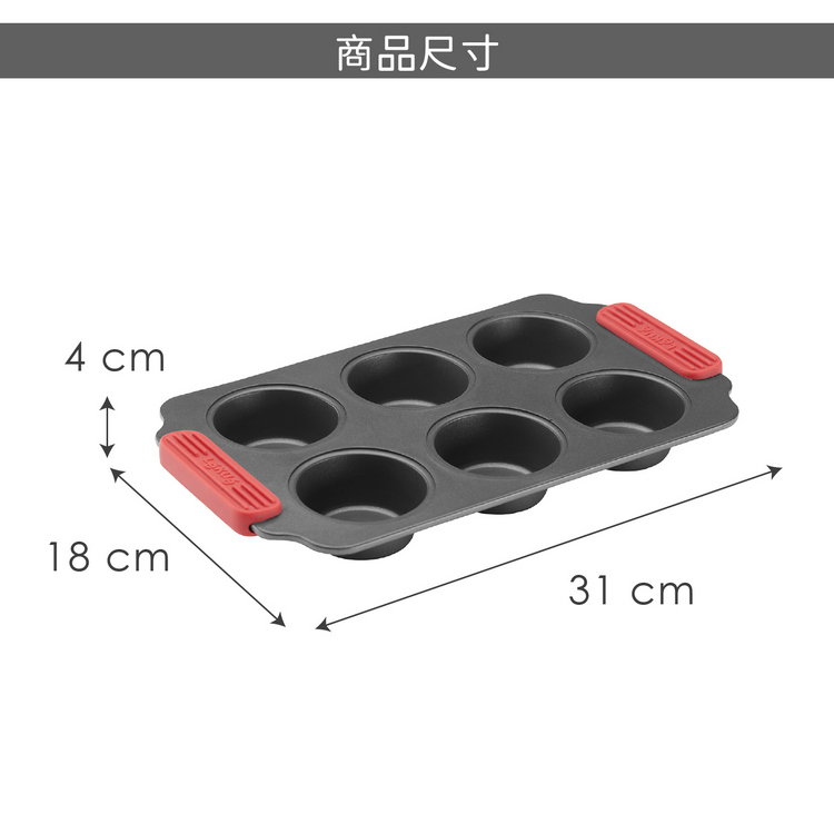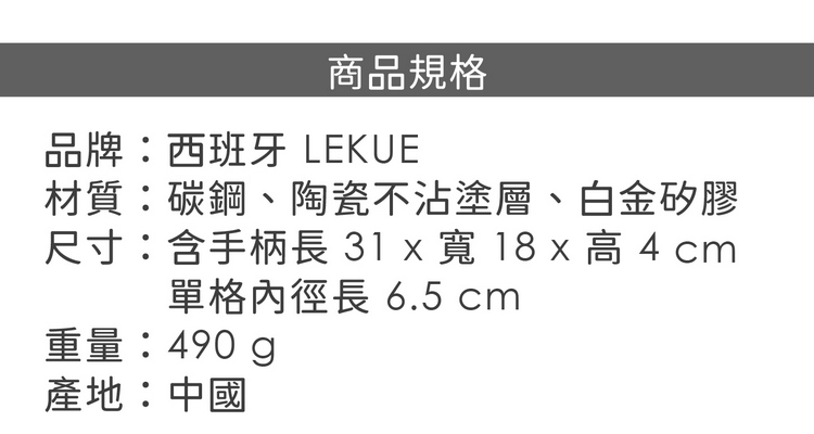 品牌:西班牙 LEKUE材質:碳鋼、陶瓷不沾塗層、白金矽膠尺寸:含手柄長 31 x 寬 18 x 高 4;單格內徑長 6.5 cm重量:490 g產地:中國