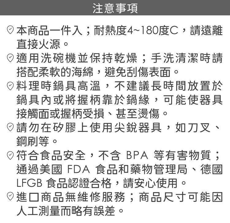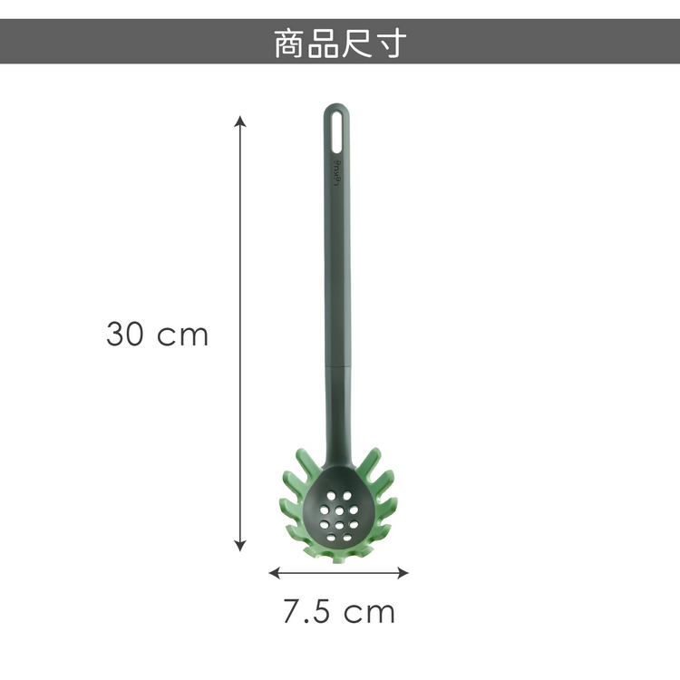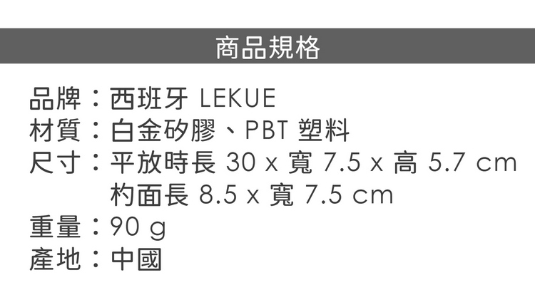 品牌:西班牙 LEKUE材質:白金矽膠、PBT 塑料尺寸:平放時長 30 x 寬 7.5 x 高 5.7 cm;杓面長 8.5 x 寬 7.5 cm重量:90 g產地:中國