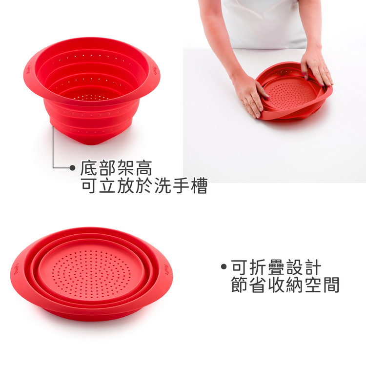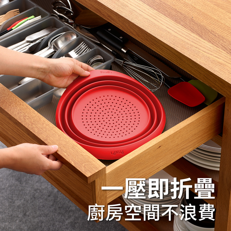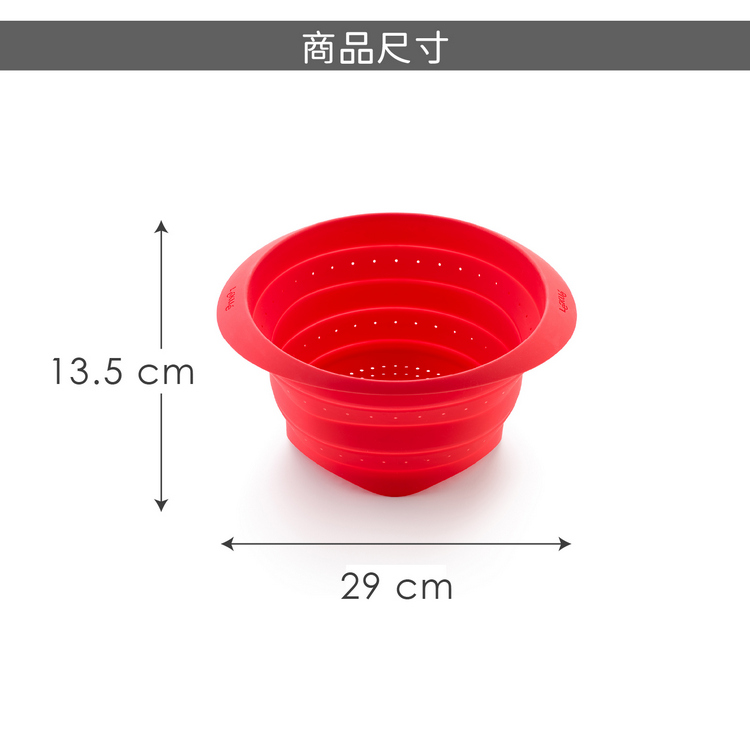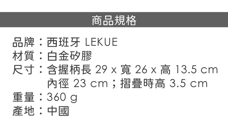 品牌:西班牙 LEKUE材質:白金矽膠尺寸:含握柄長 29 x 寬 26 x 高 13.5 cm、內徑 23 cm;摺疊時高 3.5 cm重量:360 g產地:中國