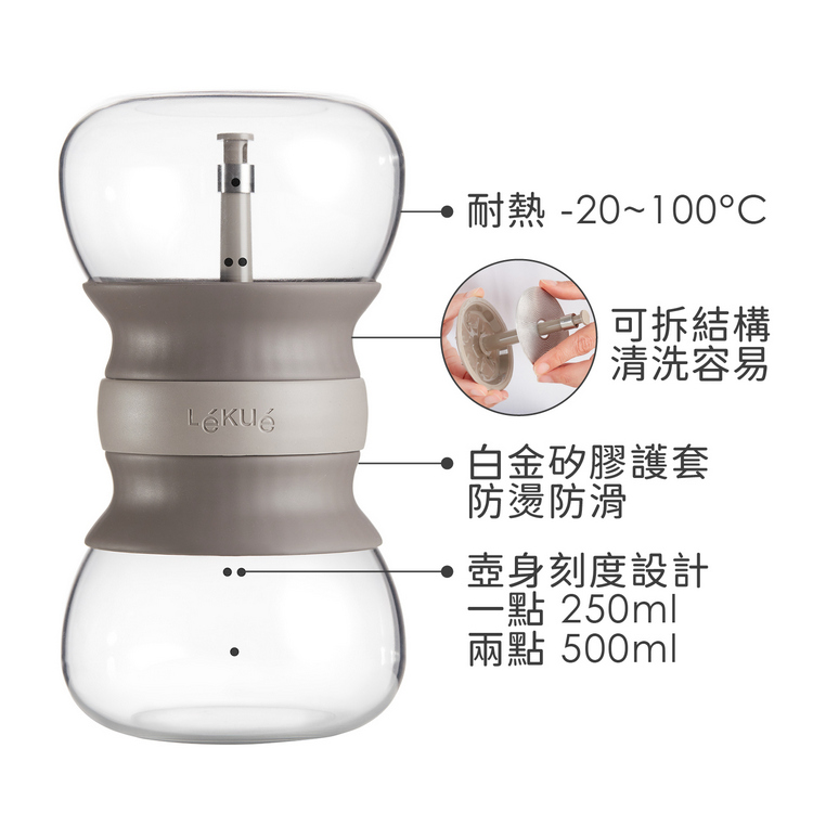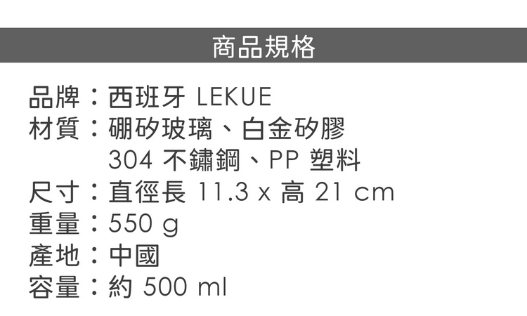 品牌:西班牙 LEKUE材質:硼矽玻璃、白金矽膠、304 不鏽鋼、PP 塑料尺寸:直徑長 11.3 x 高 21 cm重量:550 g產地:中國容量:約 500 ml