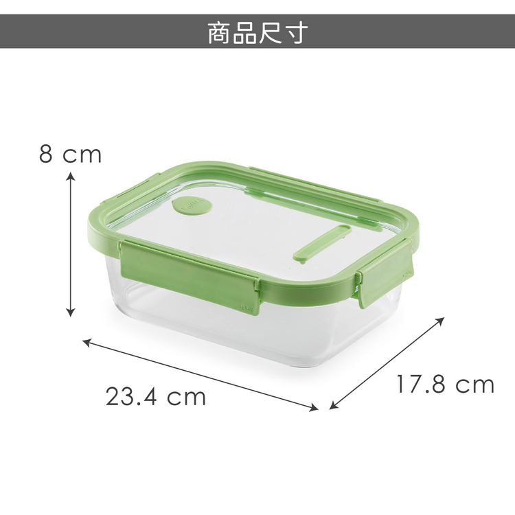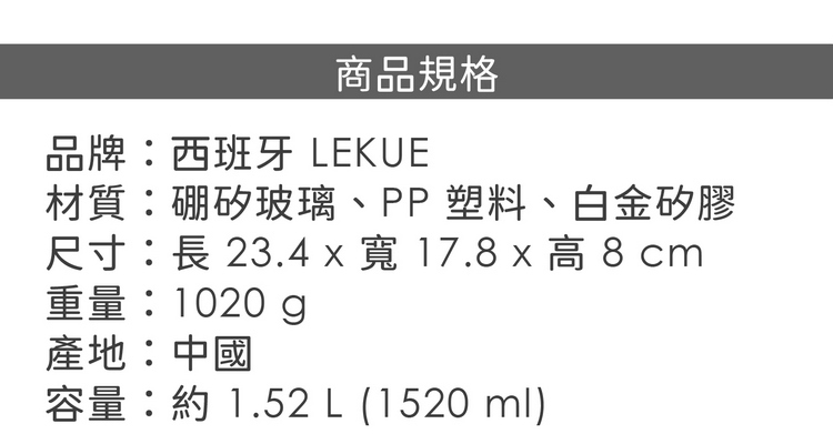 品牌:西班牙 LEKUE材質:硼矽玻璃、PP 塑料、白金矽膠尺寸:長 23.4 x 寬 17.8 x 高 8 cm重量:1020 g產地:中國容量:約 1.52 L (1520 ml)