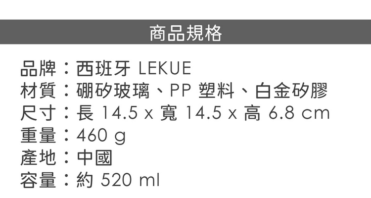 品牌:西班牙 LEKUE材質:硼矽玻璃、PP 塑料、白金矽膠尺寸:長 14.5 x 寬 14.5 x 高 6.8 cm重量:460 g產地:中國容量:約 520 ml
