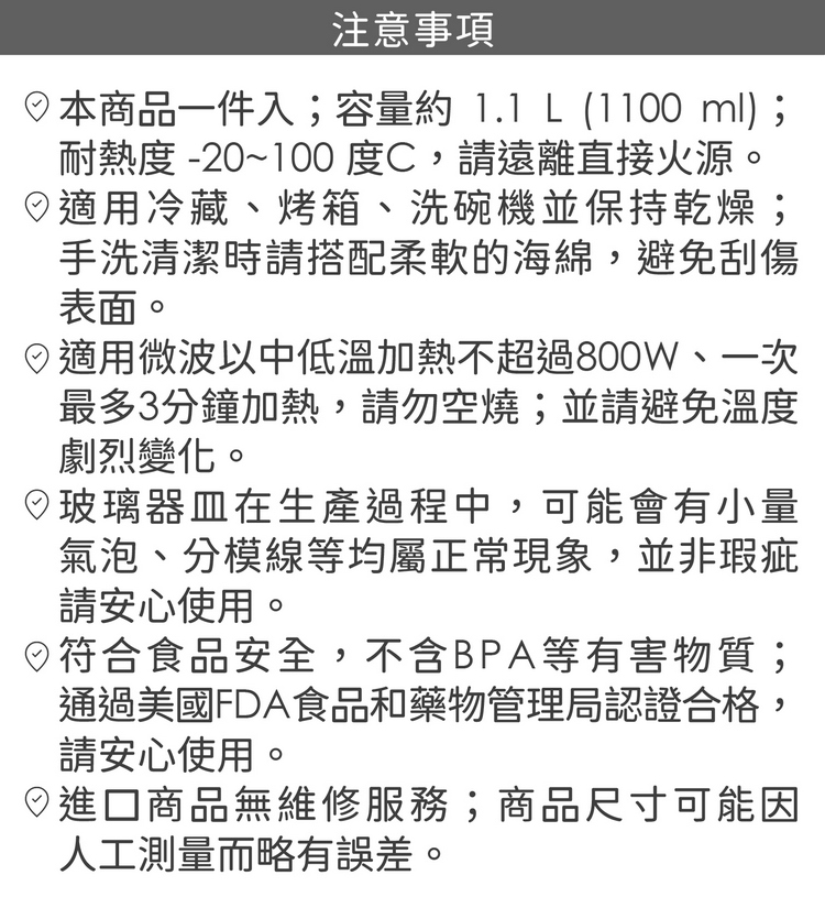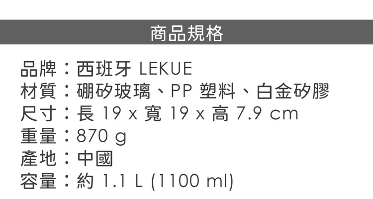 品牌:西班牙 LEKUE材質:硼矽玻璃、PP 塑料、白金矽膠尺寸:長 19 x 寬 19 x 高 7.9 cm重量:870 g產地:中國容量:約 1.1 L (1100 ml)
