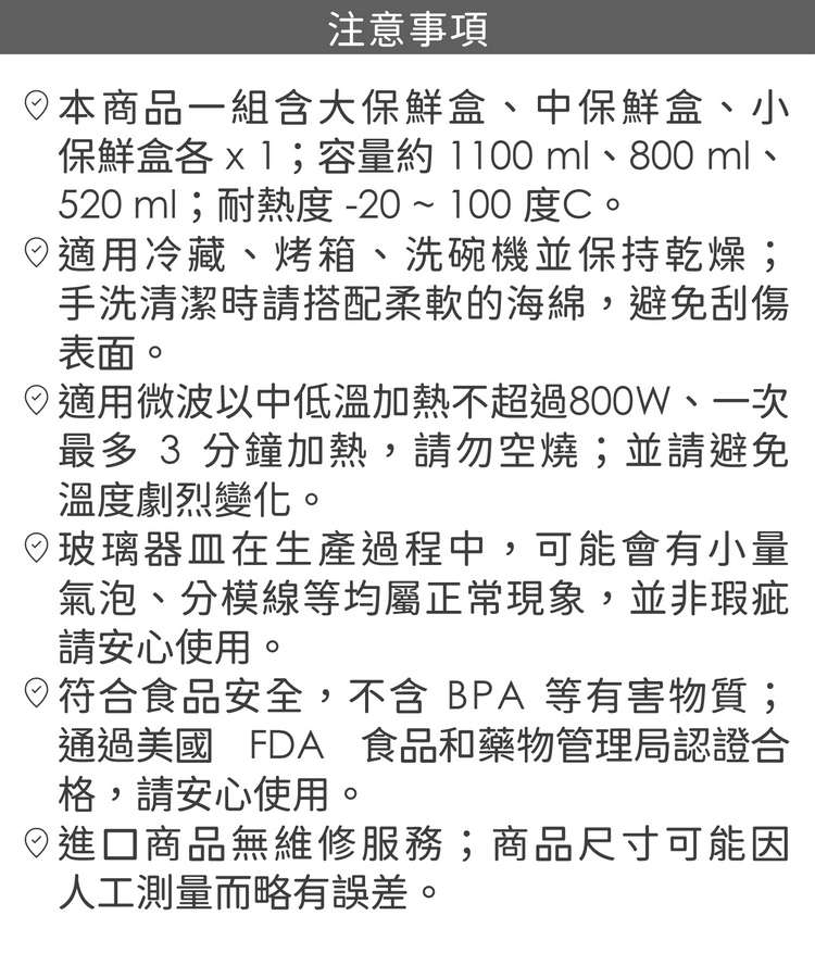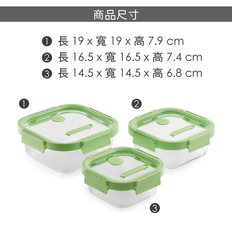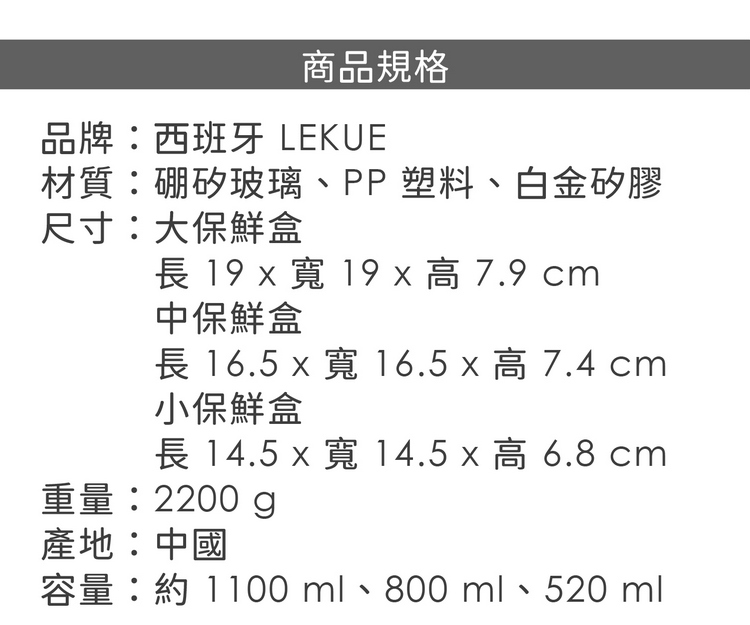 品牌:西班牙 LEKUE材質:硼矽玻璃、PP 塑料、白金矽膠尺寸:大保鮮盒長 19 x 寬 19 x 高 7.9 cm;中保鮮盒長 16.5 x 寬 16.5 x 高 7.4 cm;小保鮮盒長 14.5 x 寬 14.5 x 高 6.8 cm重量:2200 g產地:中國容量:約 1100 ml、800 ml、520 ml