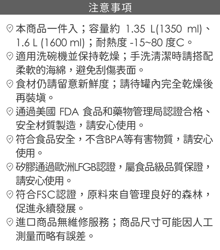 品牌:西班牙 LEKUE材質:SAN/PP 塑料、白金矽膠 (密封膠條)尺寸:長 10.5 x 寬 10.5 x 高 25.5 cm、翻轉後長 10.5 x 寬 10.5 x 高 28.5 cm重量:360 g產地:中國容量:約 1.35 L (1350 ml)、1.6 L (1600 ml)