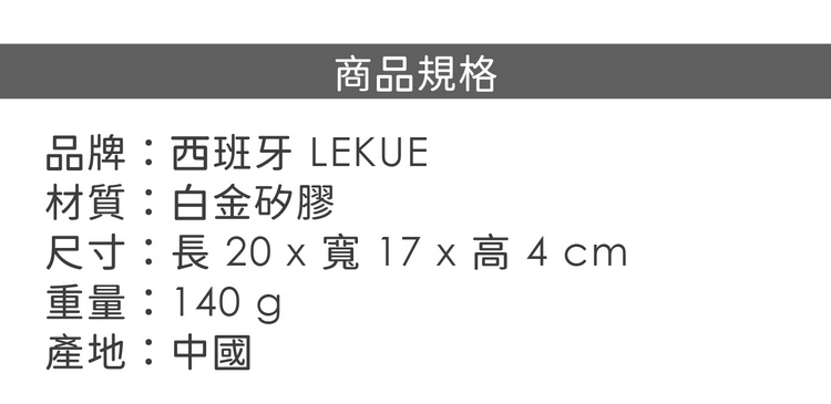 品牌:西班牙 LEKUE材質:白金矽膠尺寸:長 20 x 寬 17 x 高 4 cm重量:140 g產地:中國