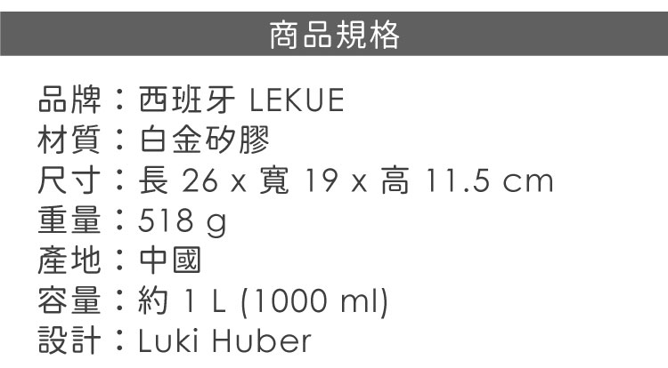 品牌:西班牙 LEKUE材質:白金矽膠尺寸:合起時長 26 x 寬 19 x 高 11.5 cm容量:約 1 L (1000 ml)重量:518 g設計:Luki Huber產地:中國