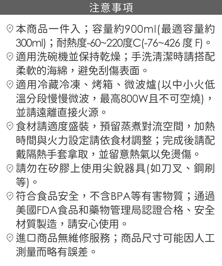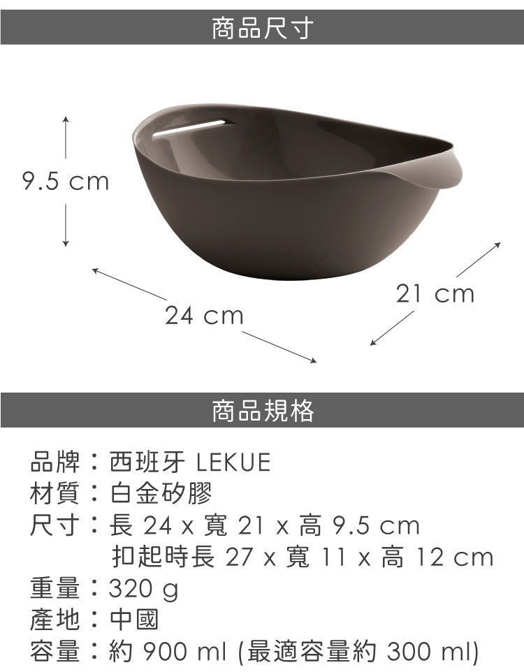 品牌:西班牙 LEKUE材質:白金矽膠尺寸:展開時長 24 x 寬 21 x 高 9.5 cm;扣起時長 27 x 寬 11 x 高 12 cm容量:約 900 ml (最適容量約 300 ml)重量:320 g產地:中國